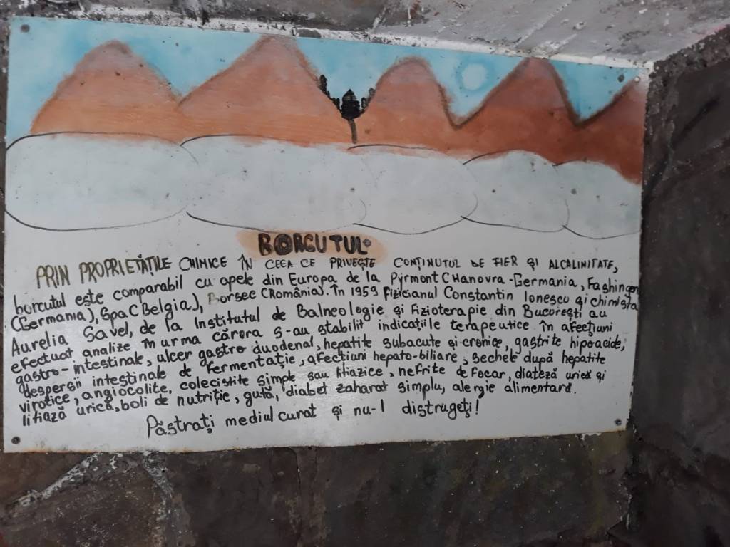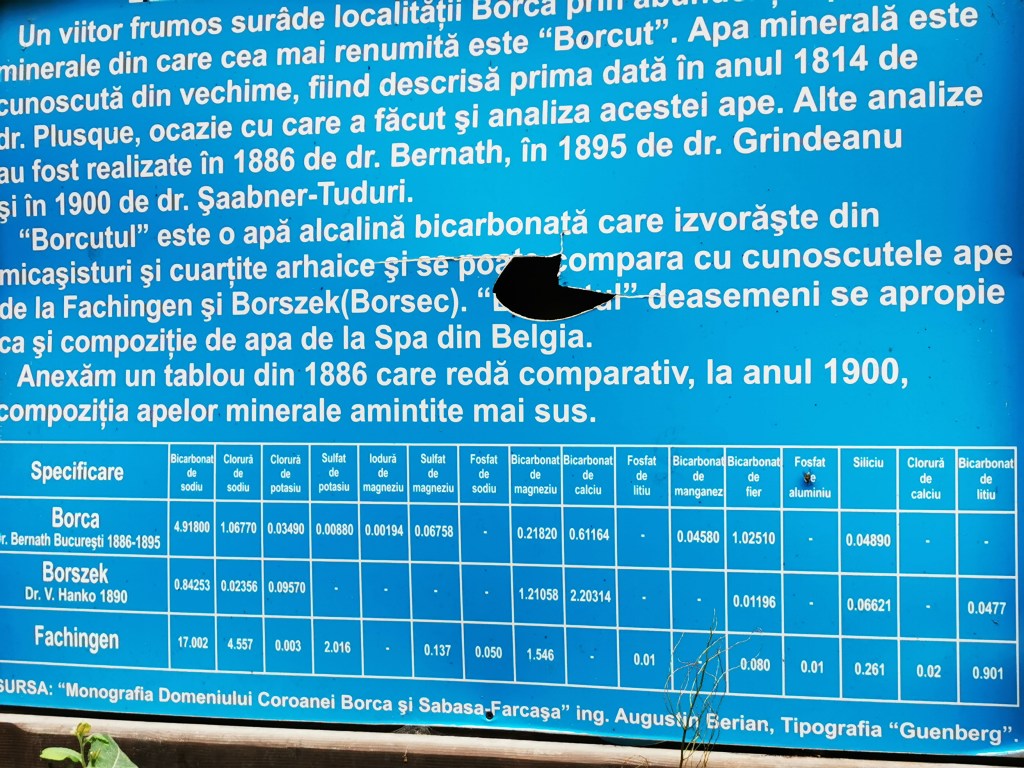 “Un viitor frumos surâde localității Borca prin abundența apelor sale minerale din care cea mai renumită este Borcut. Apa minerală este cunoscută din vechime, fiind descrisă prima dată în anul 1814 de dr. Plusque, ocazie cu care a făcut și analiza acestei ape. Alte analize au fost realizate în 1886 de dr. Bernath, în 1885 de dr. Grindeanu și în 1900 de dr. Șaabner-Tuduri. Borcutul este o apă alcalină bicarbonată care izvorăște din micașisturi și cuarțite arhaice și se poate compara cu cunoscute ape de la Fachingen și Borszek (Borsec). Borcutul de asemeni se apropie ca și compoziție de apa de la Spa din Belgia.” (pancartă a Ocolului Silvic Borca)