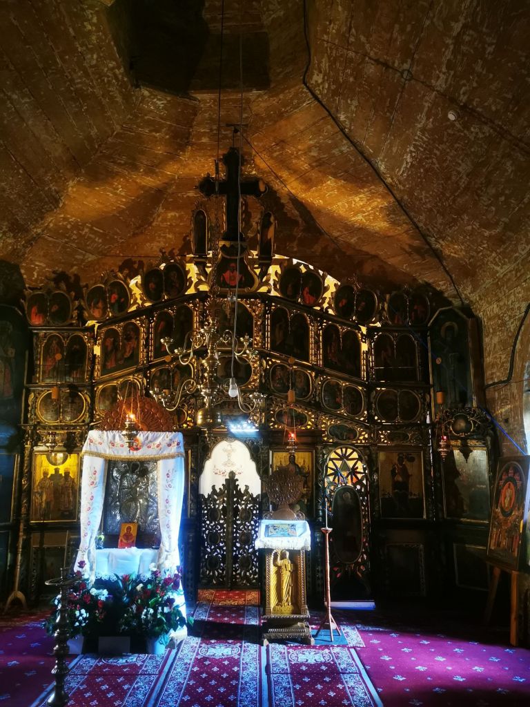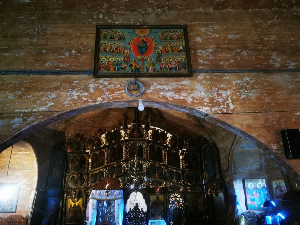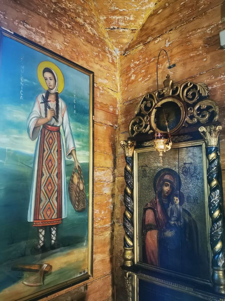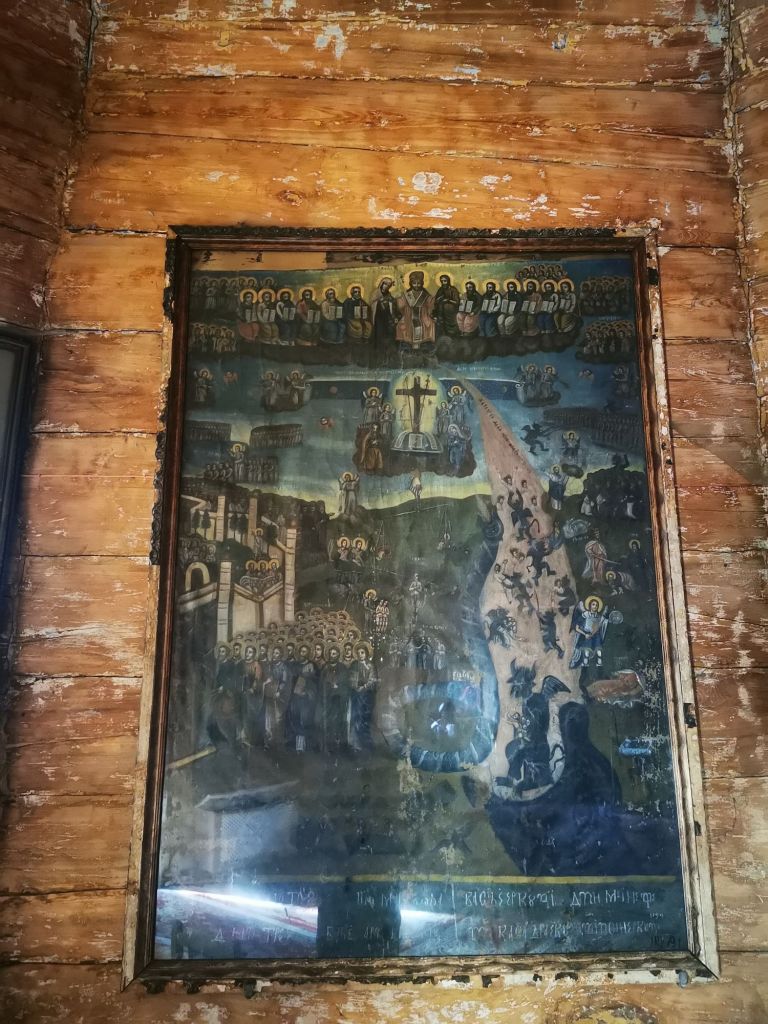 În biserică am fost impresionați de icoanele așezate pe pereții din lemn. O îmbinare de culori care te cufundă în altă vreme. Nu le mai văzusem în alte mănăstiri, pesemne că or fi destul de rare. Dar ceea ce se transmite prin acestea, aș putea zice, că înlocuiește aproape suficient pictura lăcășului.