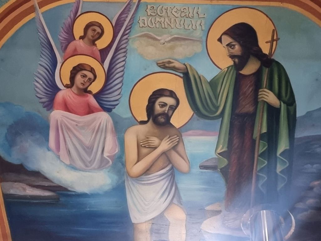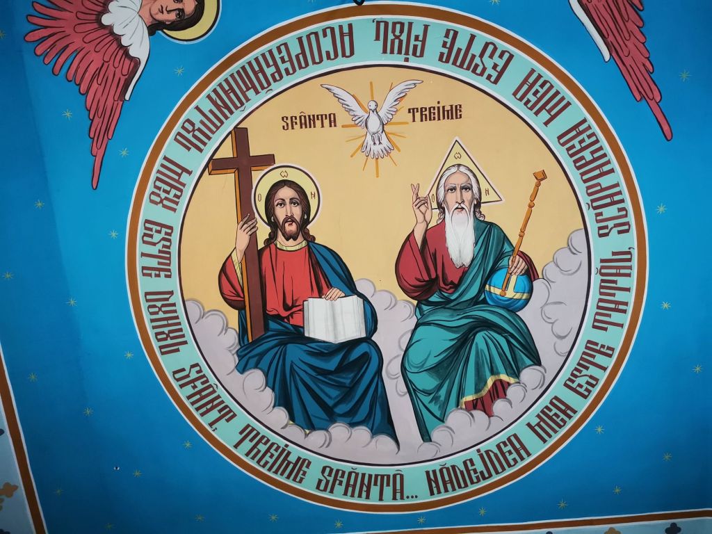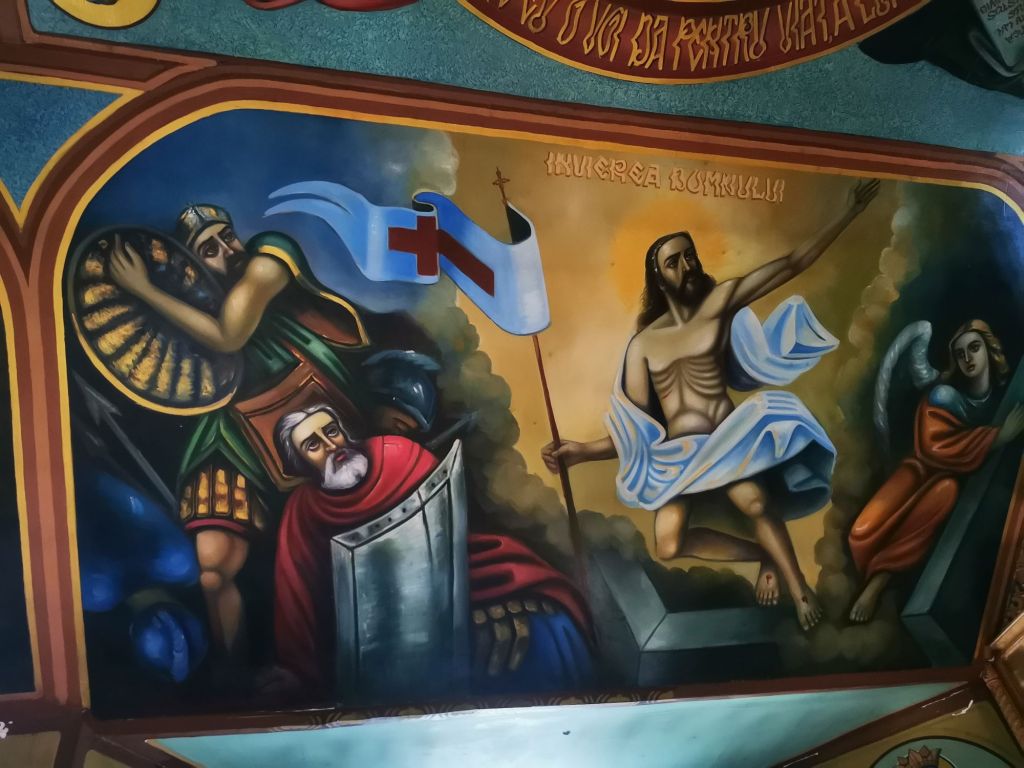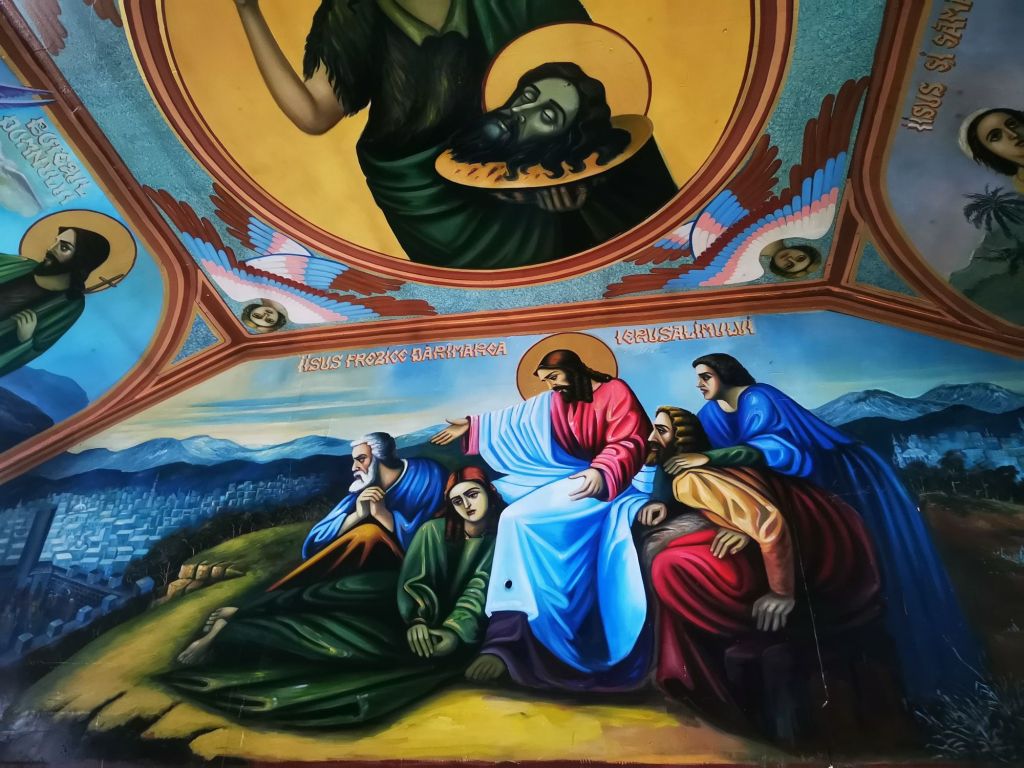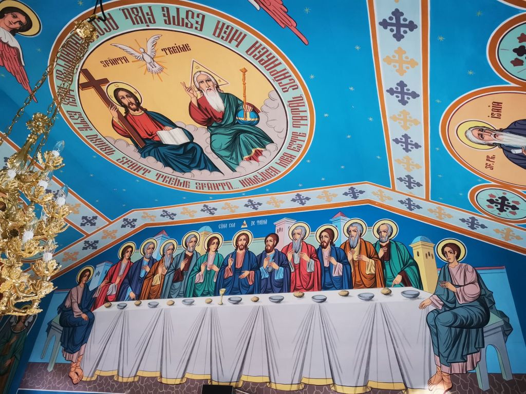 Acolo, la mănăstire, o liniște deplină. Ne întrebam dacă este deschisă poarta și speram să putem intra să ne închinăm. O maică a ieșit și ne-a deschis, pesemne că ne și auzise. Aflasem mai apoi că nu se aștepta la vizitatori, pentru că acolo ajunge foarte puțină lume și mai ales la ora aceea, când ziua aproape se îngâna cu noaptea. În fața noastră stătea maica stareță care, de fapt aștepta un preot călugăr de la Mănăstirea Pângărați pentru a face slujba de seară (ora 17:00). Ne-a condus în biserică unde am și petrecut aproximativ 20 de minute…de rugăciune. Altceva nu-ți venea să faci decât să te rogi. Aceasta era atmosfera pe care o simțeai de cum intrai. Abia după rugăciune putem spune că am vizitat biserica, unde am fost impresionați de o pictură, aș zice unică, până acum, dintre cele văzute de noi. Culori pastelate în care predomină nuanțele cerului. Probabil de aici se și creează atmosfera de legătura spirituală cu celestul. De asemenea, unele scene biblice nu le-am mai întâlnit reprezentate cel puțin la acest nivel, de ex. Iisus și samariteanca, Învierea Domnului sau Iisus prezice dărâmarea Ierusalimului.