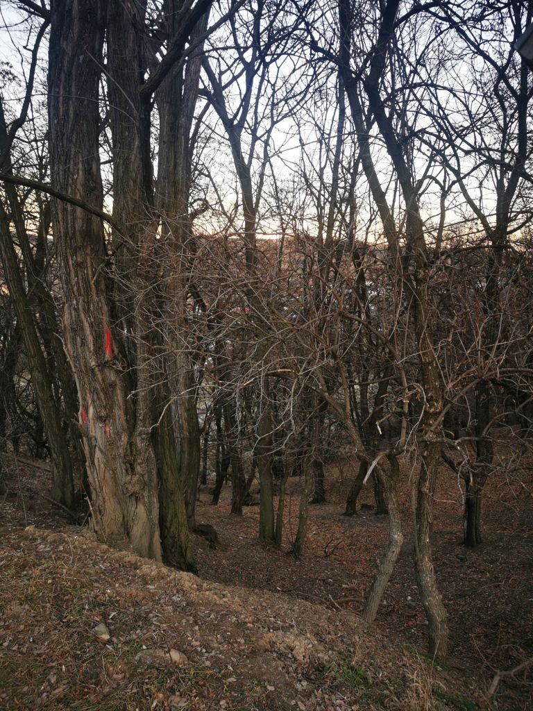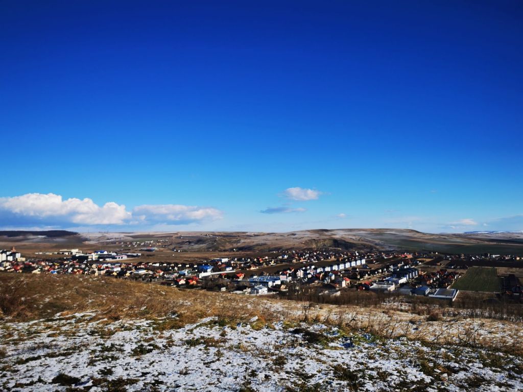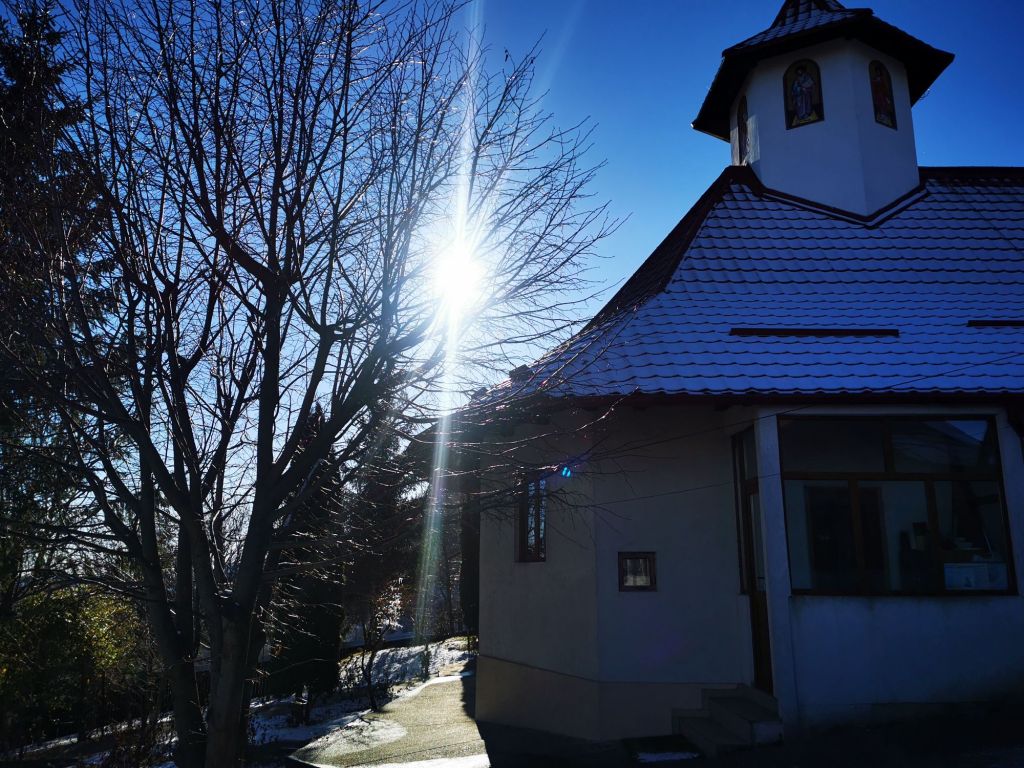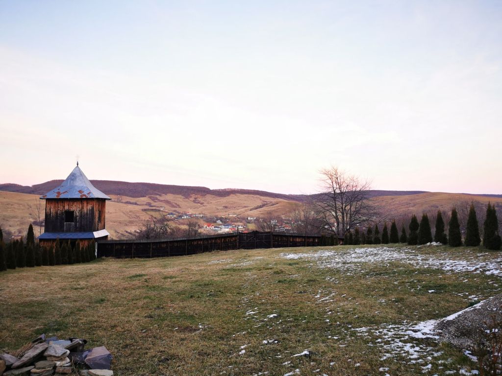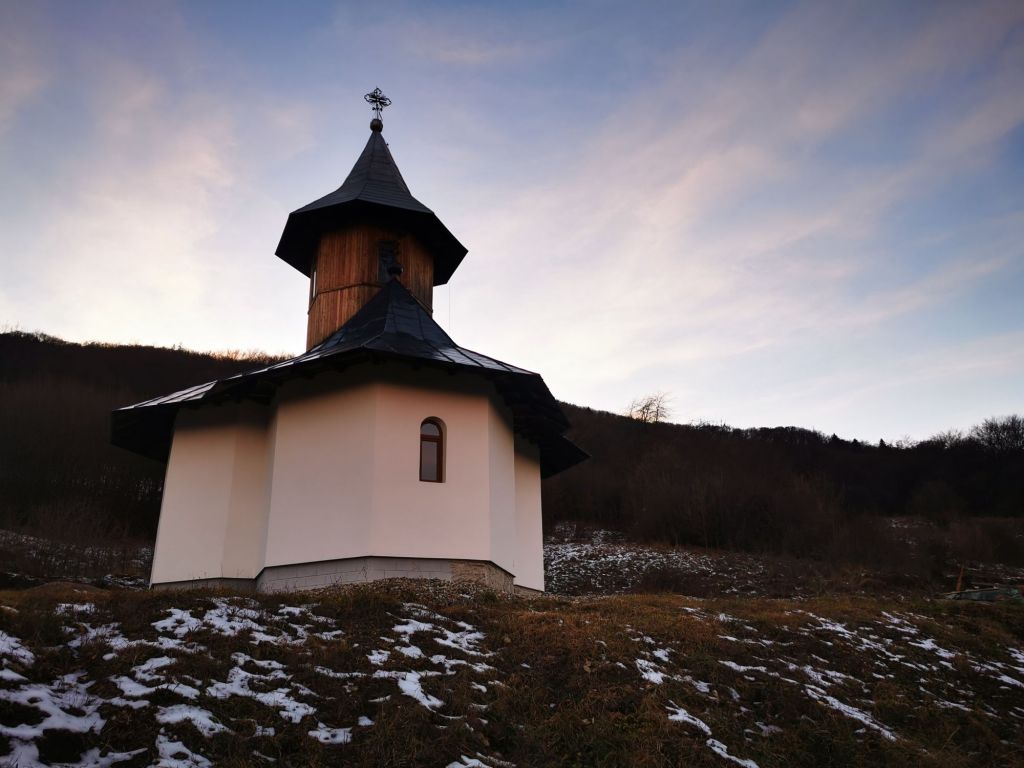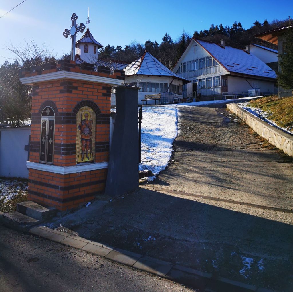 În schimb, platoul pe care se află schitul este foarte frumos. Ne oprim câteva momente pentru a admira dealurile din zare, cu cele câteva așezări și luminițe care încep să licăre. O liniște rece, dar foarte plăcută, mai ales că nu e ceva la care să te aștepți să găsești într-un oraș.