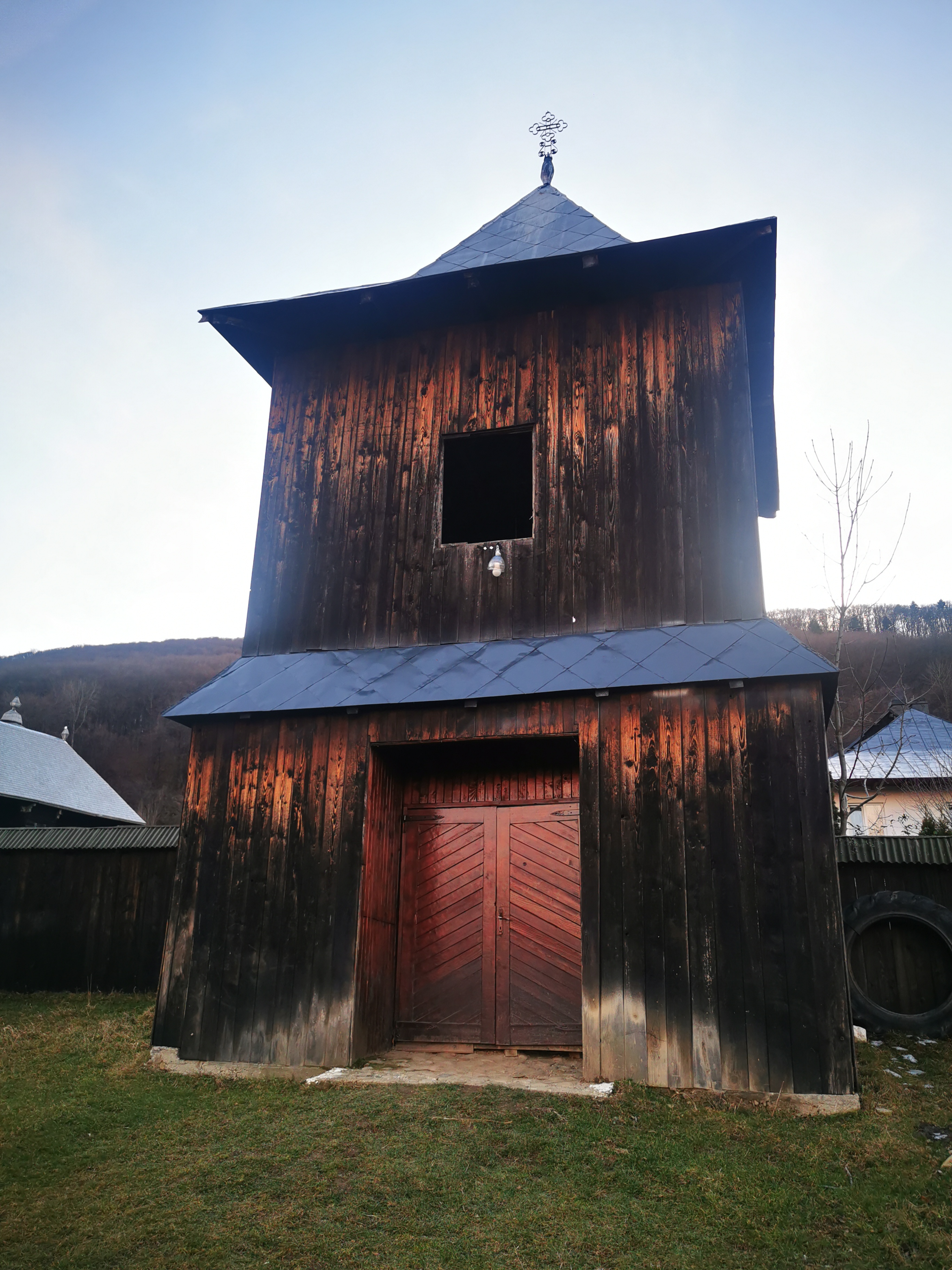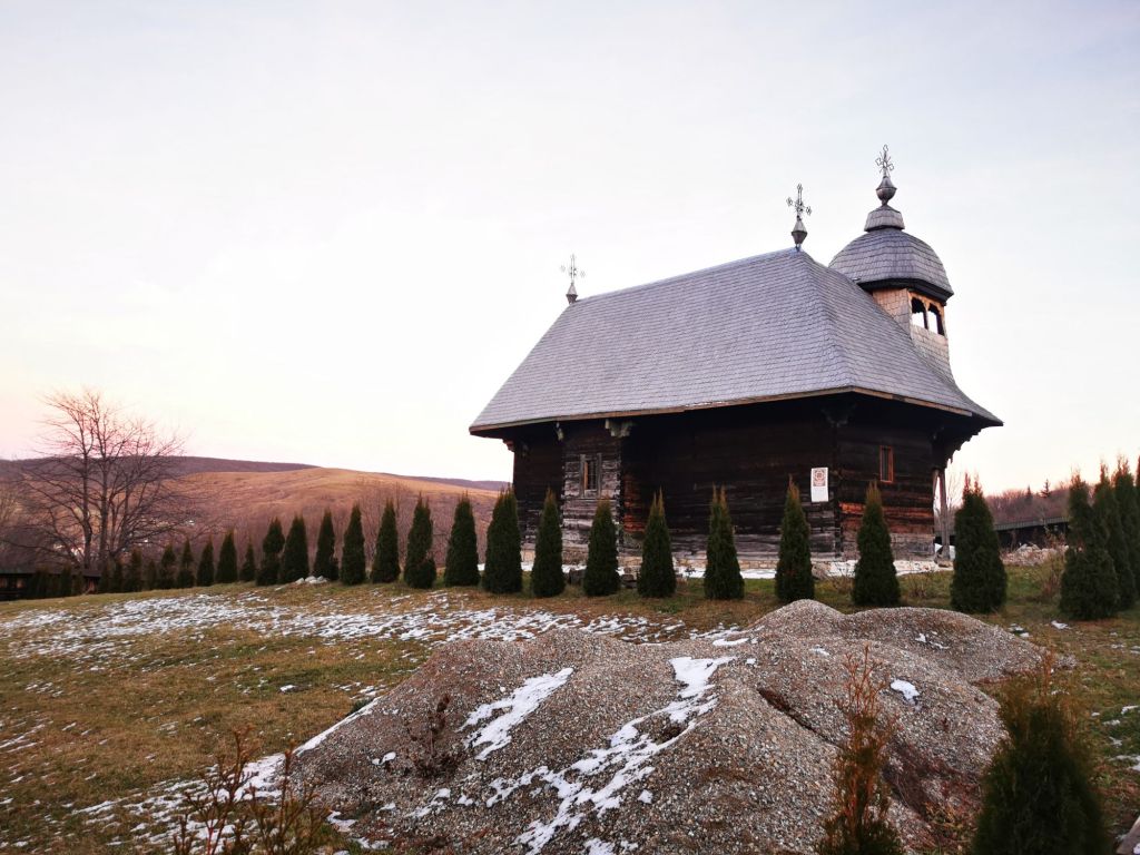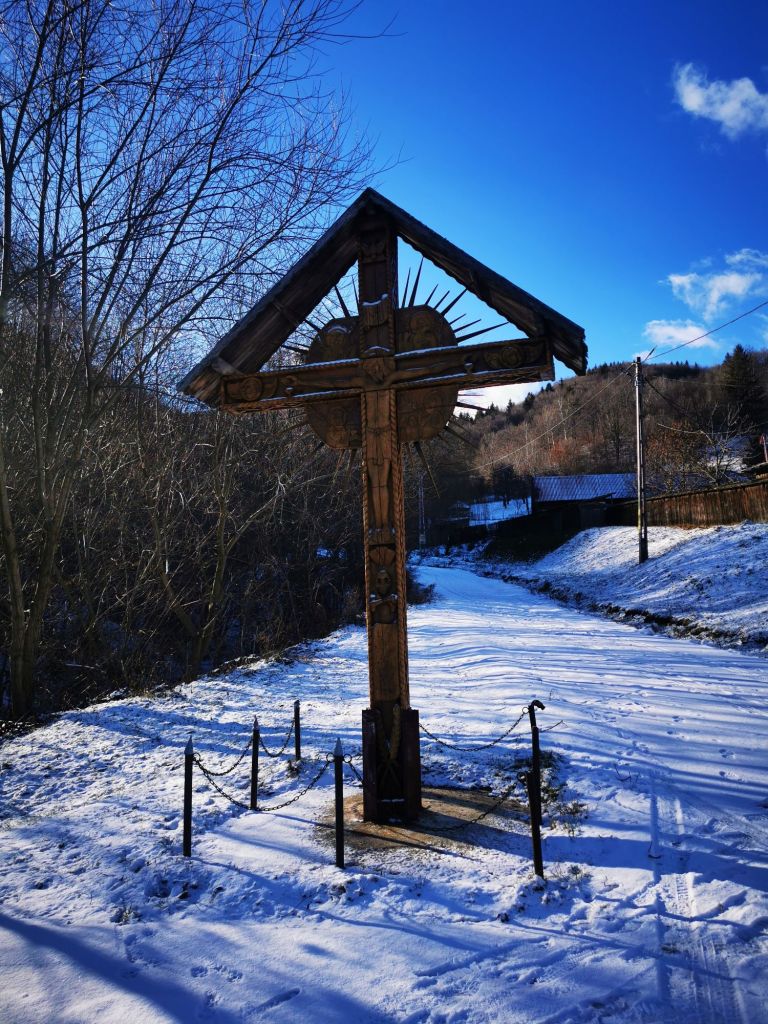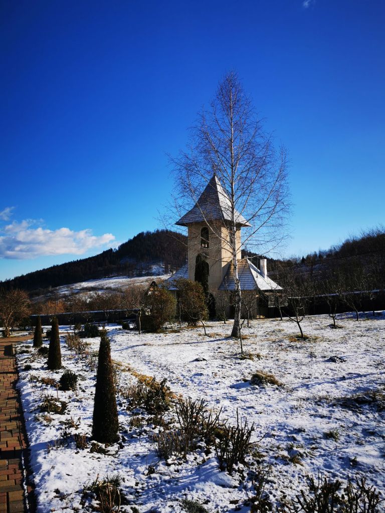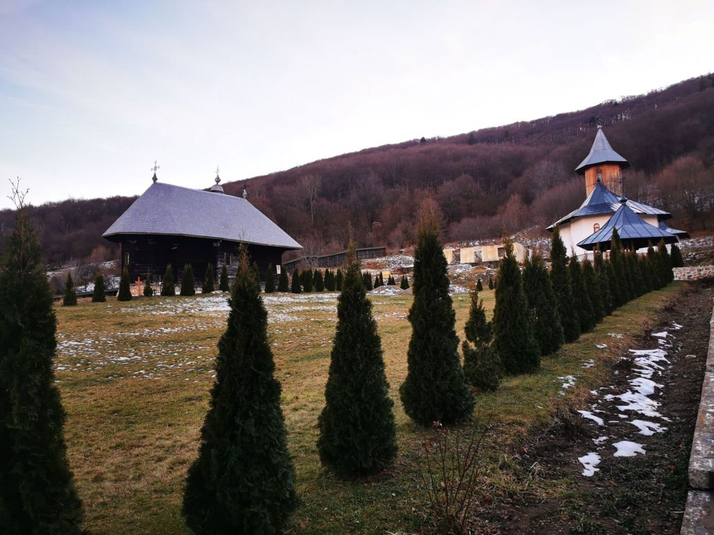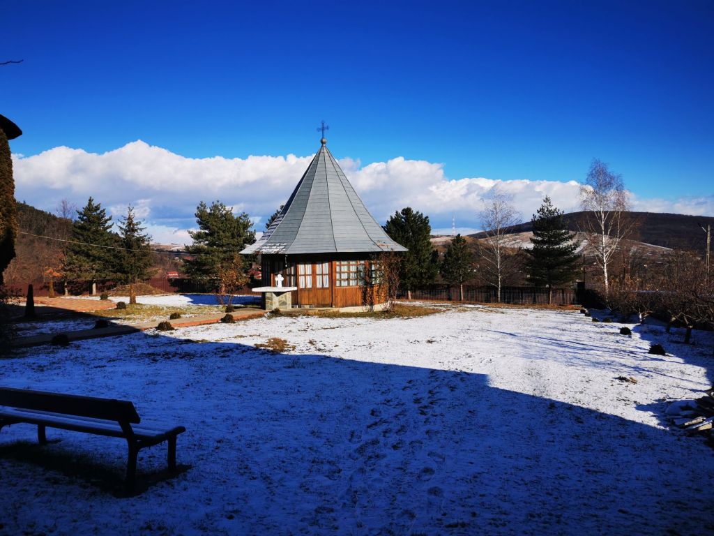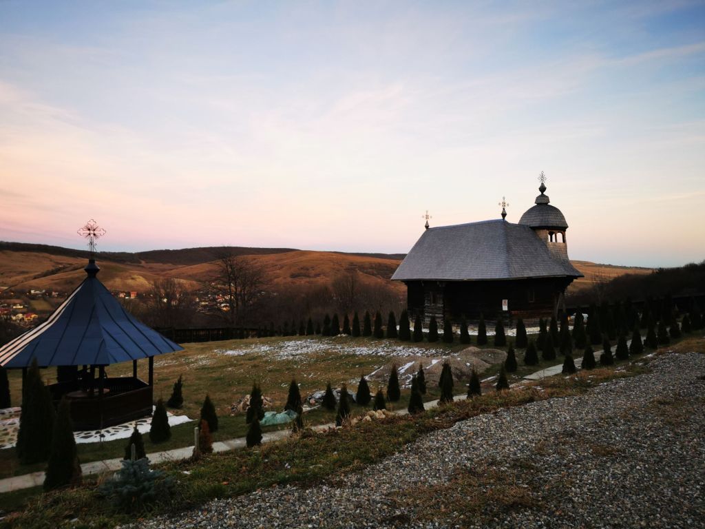 Înaintăm și deschidem poarta grea. Urcăm și ne oprim prima dată la biserica cea veche, din lemn. Este închisă. Ne așteptam, dar o observăm de jur împrejur. Cu siguranță ne vom mai întoarce și în altă zi, de vară. În jurul ei vedem pietre vechi și cruci de lemn. Sunt morminte…oarecum de demult, părăsite, însă nu putem ști sigur că nu mai poartă amprenta celor care au fost. Facem o cruce și ne spunem în gând, Dumnezeu să vă ierte, rugați-vă și pentru noi, cei de aici. Le ocolim ușor și înaintăm spre biserica din piatră, între timp, conduși de o pisicuță care saltă bucuroasă la vederea oaspeților rătăciți la ceas de seară. Sus în deal, după niște stupi, latră un câine singuratic.