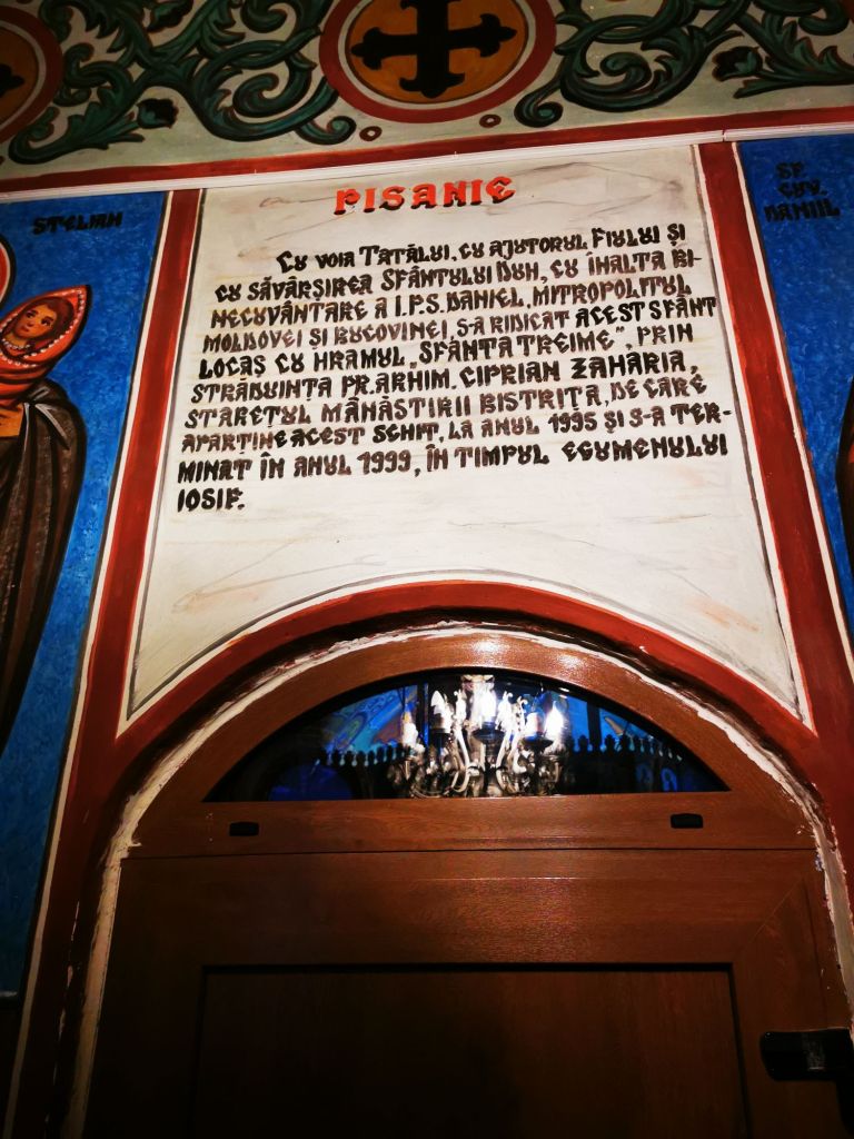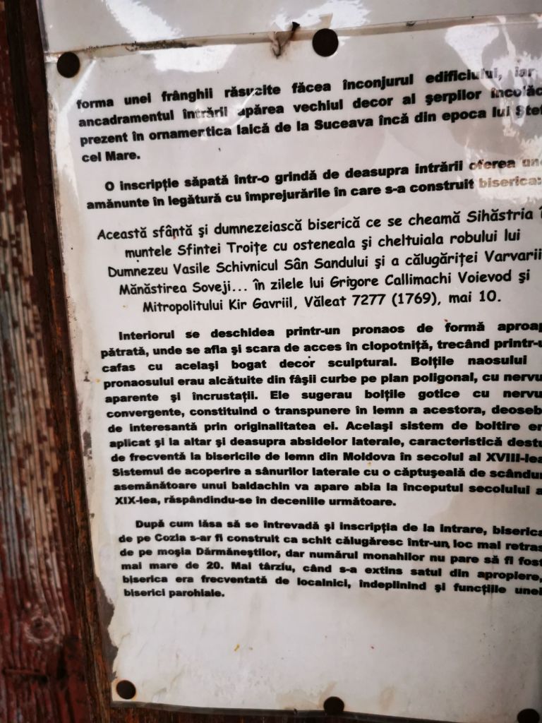 „Această sfântă și dumnezeiască biserică care se chiamă sâhăstrie în muntele Cozla, în poiana Draga ot Dărmăneștii Neamțului și s-au rădicat în numele sfântii Troița, cu osteneala și cheltuiala robului lui Dumnezeu Vasile Schimnicul sân Sandului și a călugăriței Varvara ot mănăstire Soveji și s-au făcut întru ertarea pacatelor lui și a tot neamul lui, întru vecinica lor pomenire în vecii vecilor, amin. În zilele Mării Sale IO Grigore Calimah Voevod și Mitropolit fiindu chir Gavriil. Veleat 7272 main 10 (1769)”.