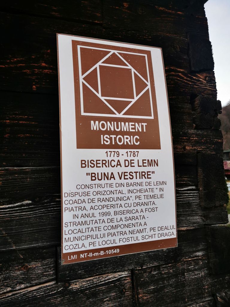”Biserică monument istoric a fost adusă din cartierul Sărata al oraşului Piatra Neamţ şi s-a montat în incinta schitului, la 40 m est de biserica din zid. Este o construcţie în formă de cruce, lungă de 14 m şi lată de 6 m, din grinzi de stejar îmbinate în coada rândunicii (fără cuie). A fost ridicată în anul 1790 de meşterii dobrogeni, plutaşi pe Bistriţa, în semn de recunoştinţă că într-o împrejurare grea au fost ajutaţi de locuitorii oraşului Piatra Neamţ. Are o turlă pătrată pe pridvorul deschis şi este acoperită cu şindrilă. Slujbele în biserica-monument istoric se fac de două-trei ori pe an”.