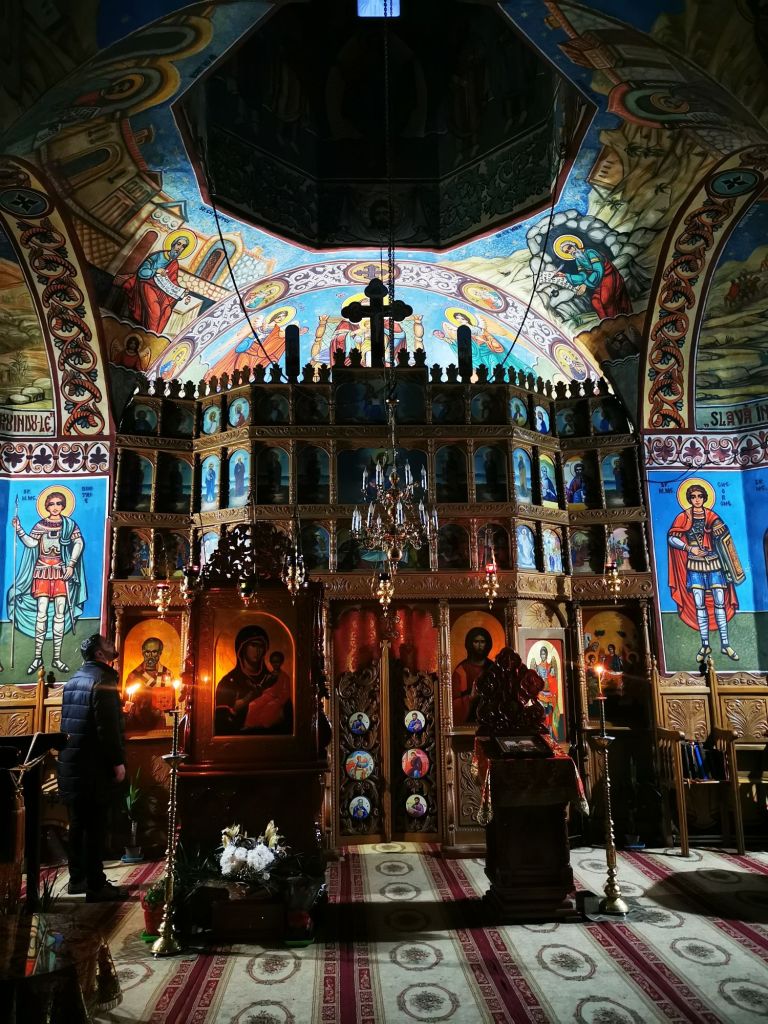 E slujbă. Un călugăr, în genunchi, în fața icoanei Maicii Domnului, la lumina lumânării, citește rugăciuni și se închină. Ne punem și noi jos, cu oarecare frică, să nu deranjăm momentul. Ne liniștim imediat, pare că nu ne observă nimeni. Din strană, auzim un cântăreț, completează rugăciunea călugărului îngenuncheat. Urmează apoi o liniște, în suflet…După care, începem să ne rugăm și noi, așa în genunchi, în timp ce trecem cu mintea pe la cei dragi. Pare-mi-se că timpul nu mai este…