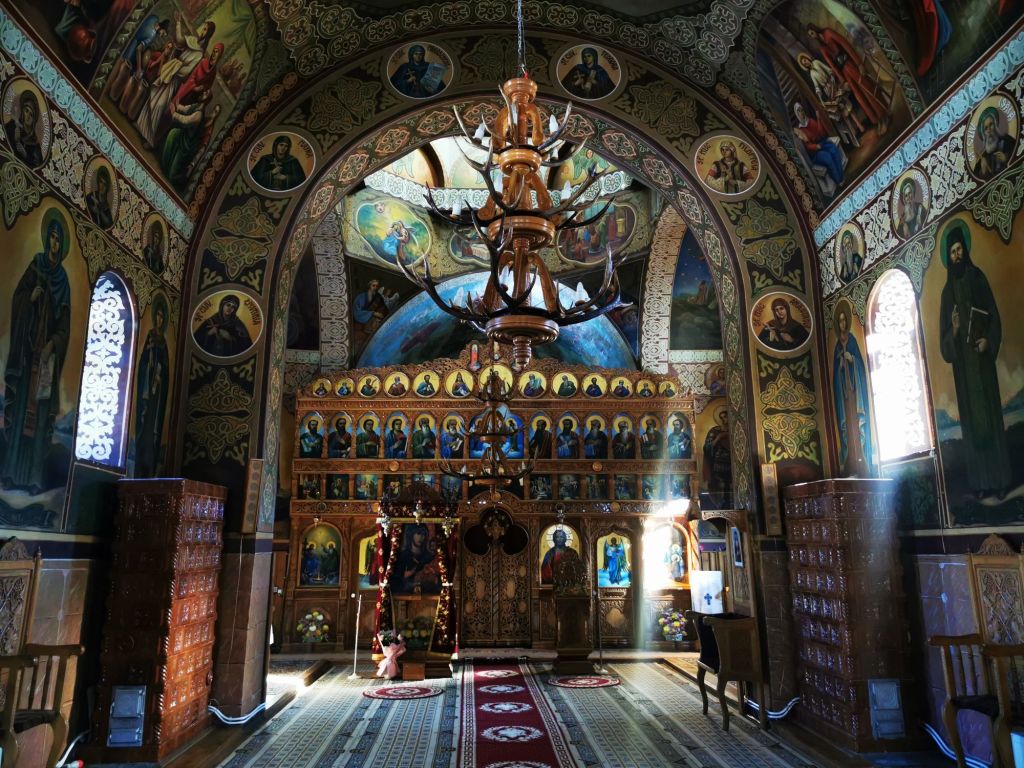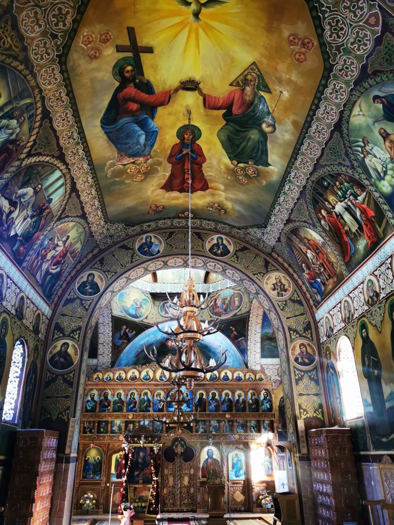 Altarul, cu firide în ambele părți, are boltă semicilindrică, la est închisă cu jumătate de boltă semisferică, cu nervuri (văruită ulterior necorespunzător). Bolțile altarului, proscomidiei, diacomiconului, a sânurilor naosului și a tindei femeilor, sânt deci diferite.